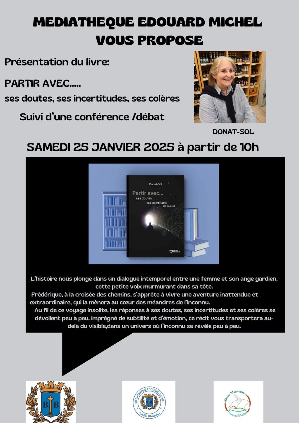 “ La médiathèque Edouard Michel a le plaisir d’accueillir :Donat-Sol afin de présenter son livre : Partir avec… ses doutes, ses incertitudes, ses colères. Cette présentation sera suivie d’une conférence/débat ”