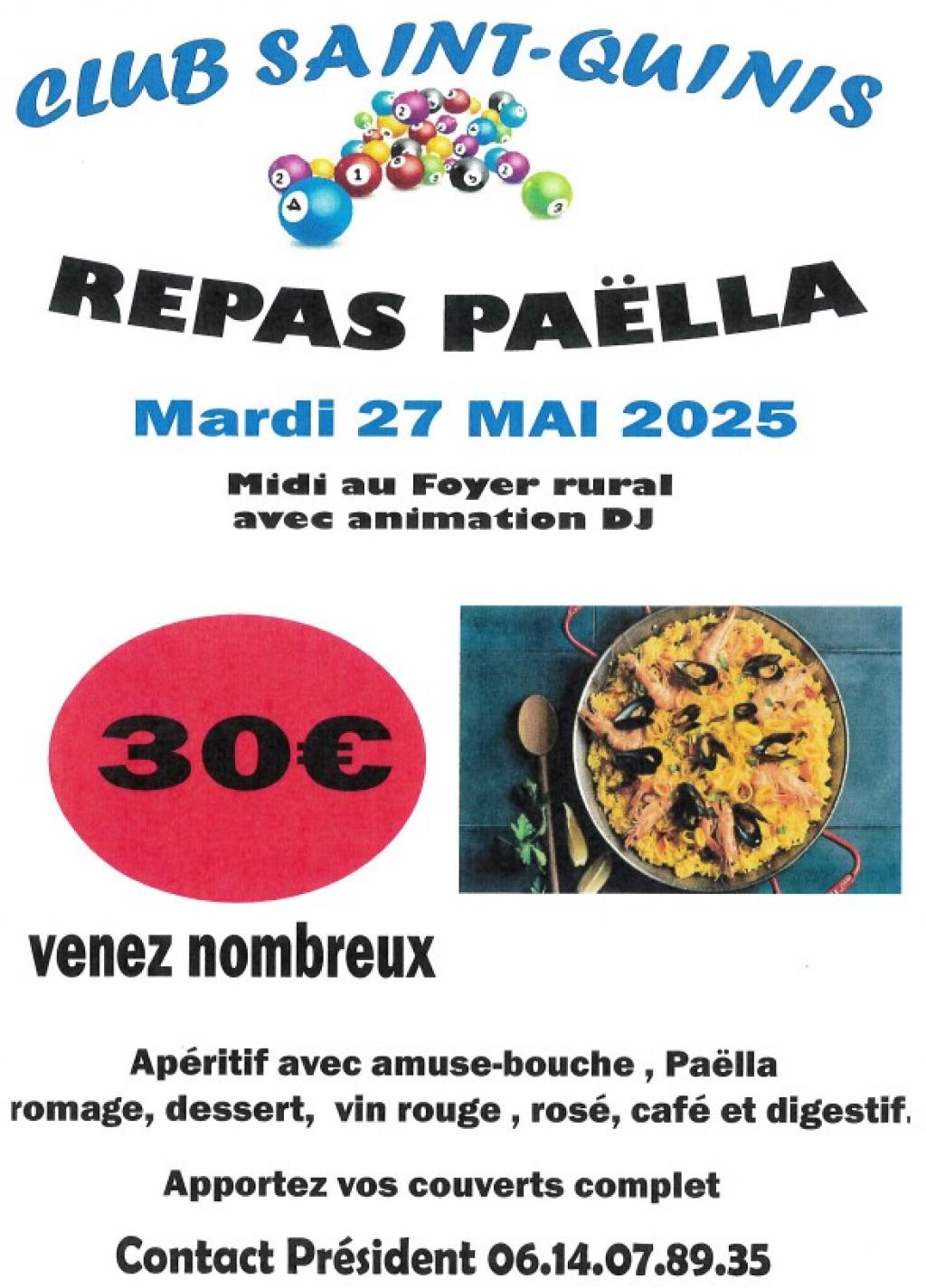 “ Grand repas du Club Saint-Quinis avec animation Dj. Apéritif avec amuse-bouche, Paëlla, fromage, dessert, vin rouge, rosé, café et digestif. Apportez vos couverts. Inscriptions par téléphone. ”