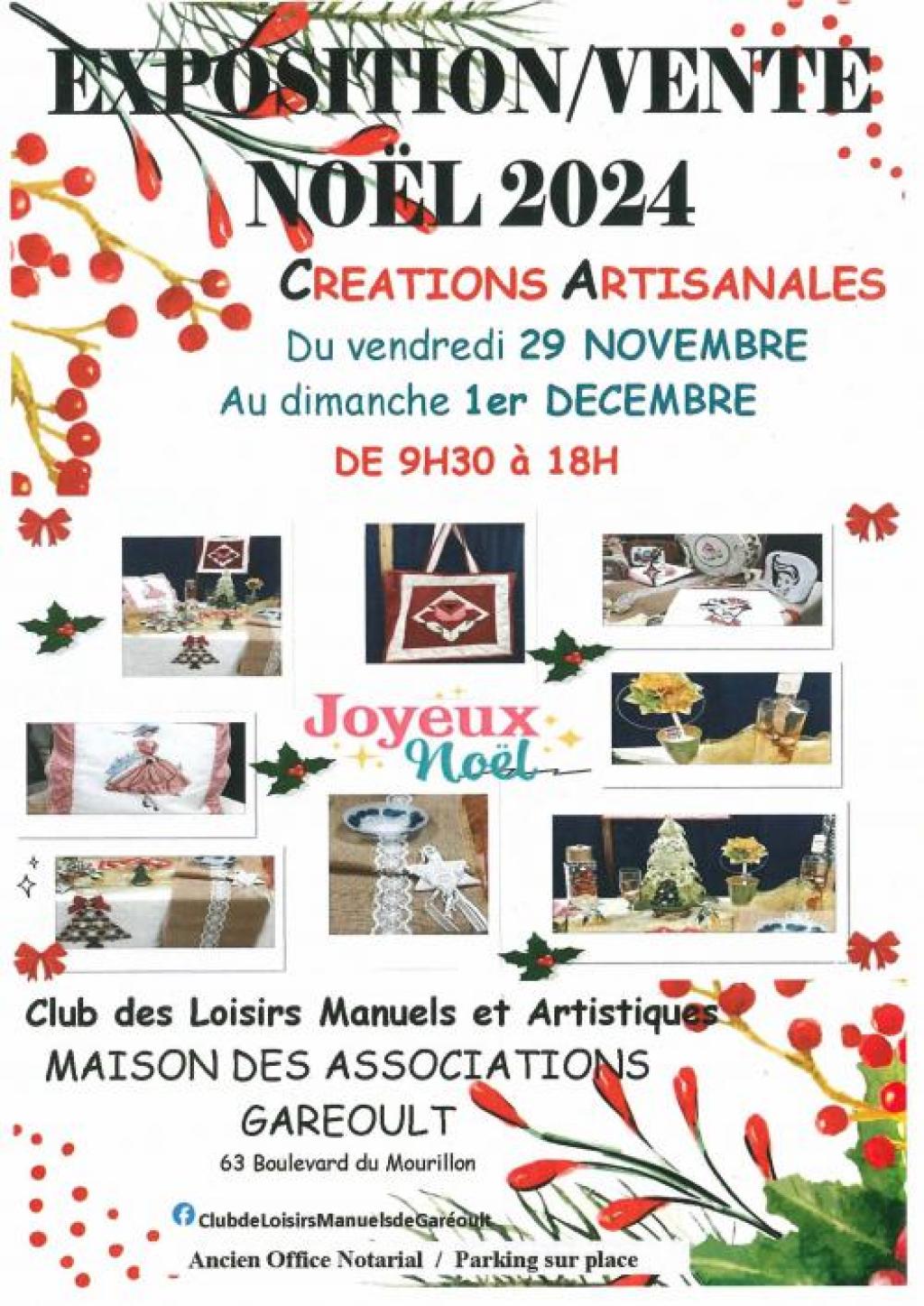 “ Créations artisanales de Noël Des idées cadeaux à petits prix et décorations de Noël faites par le Club des Loisirs Manuels et artistiques de Garéoult. ”