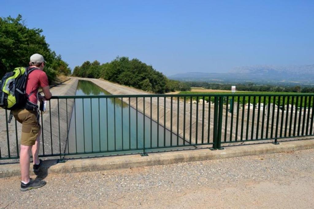 Du parking, suivre le panneau bleu et partir dos à la route sur la piste jouxtant le champ de vignes. Après 100 m, passer sous le pont du chemin de fer et s’engager directement sur la piste à droite, en laissant le petit pont à gauche. Longer le champ de vignes sur 600 m, puis traverser le canal et quitter la piste pour entamer la montée à droite sur un sentier surcreusé en son centre (balisage bleu). Retrouver la piste 200 m plus loin et continuer à s’élever face au Mont Aurélien sur 450 m.