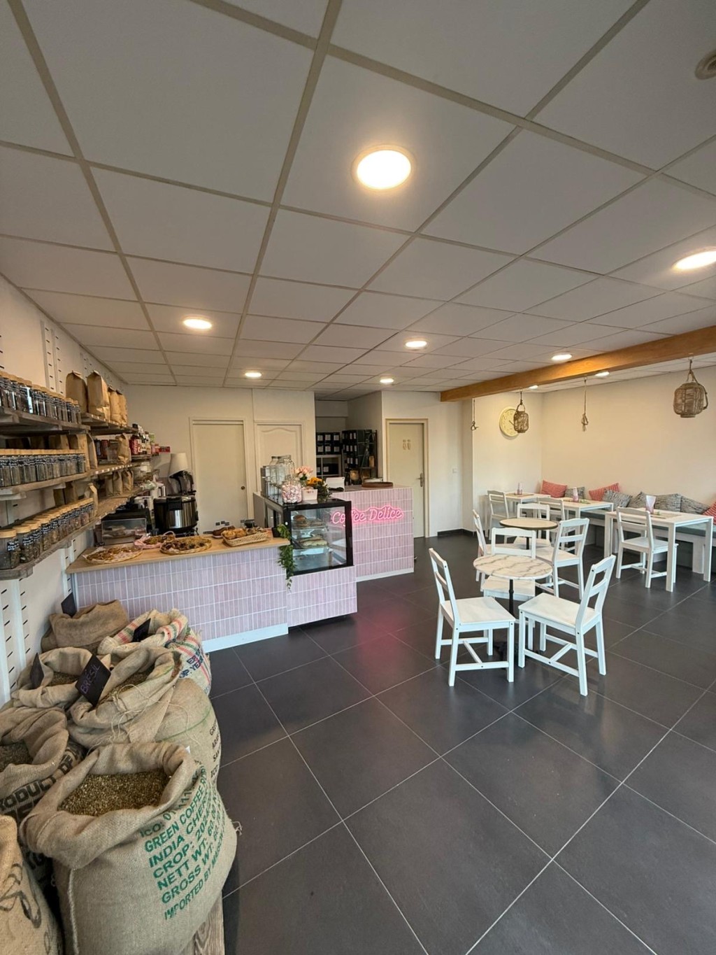 Café tendance ambiance cosy. Un lieu chaleureux et moderne, où l’ambiance douce, le bois, les couleurs pastel et les touches végétales donnent instantanément envie de s’installer et de savourer un moment gourmand.