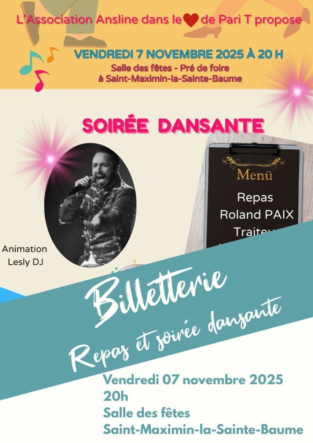 “ Repas de saison proposé par Roland Paix traiteur et soirée dansante avec Lesly DJ. Les bénéfices seront reversés à l'AFM Téléthon ”