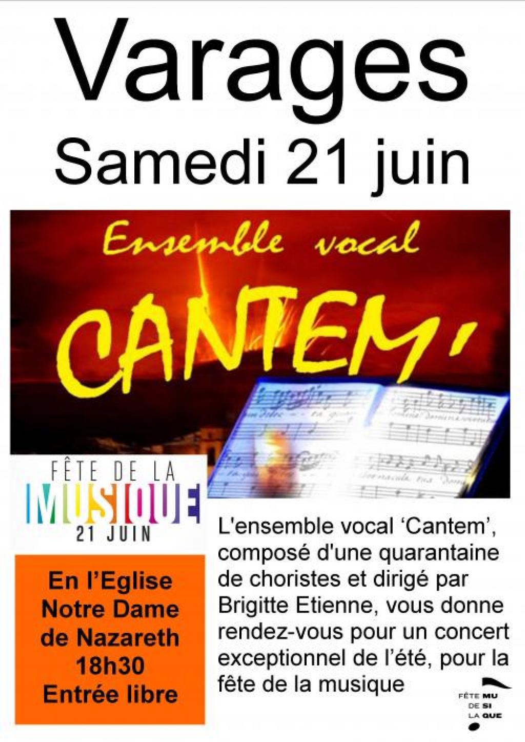 “ L'ensemble vocal Cantem, composé d'une quarantaine de choristes et dirigé par Brigitte Etienne vous donne rendez vous pour un concert pour la fête de la musique ”