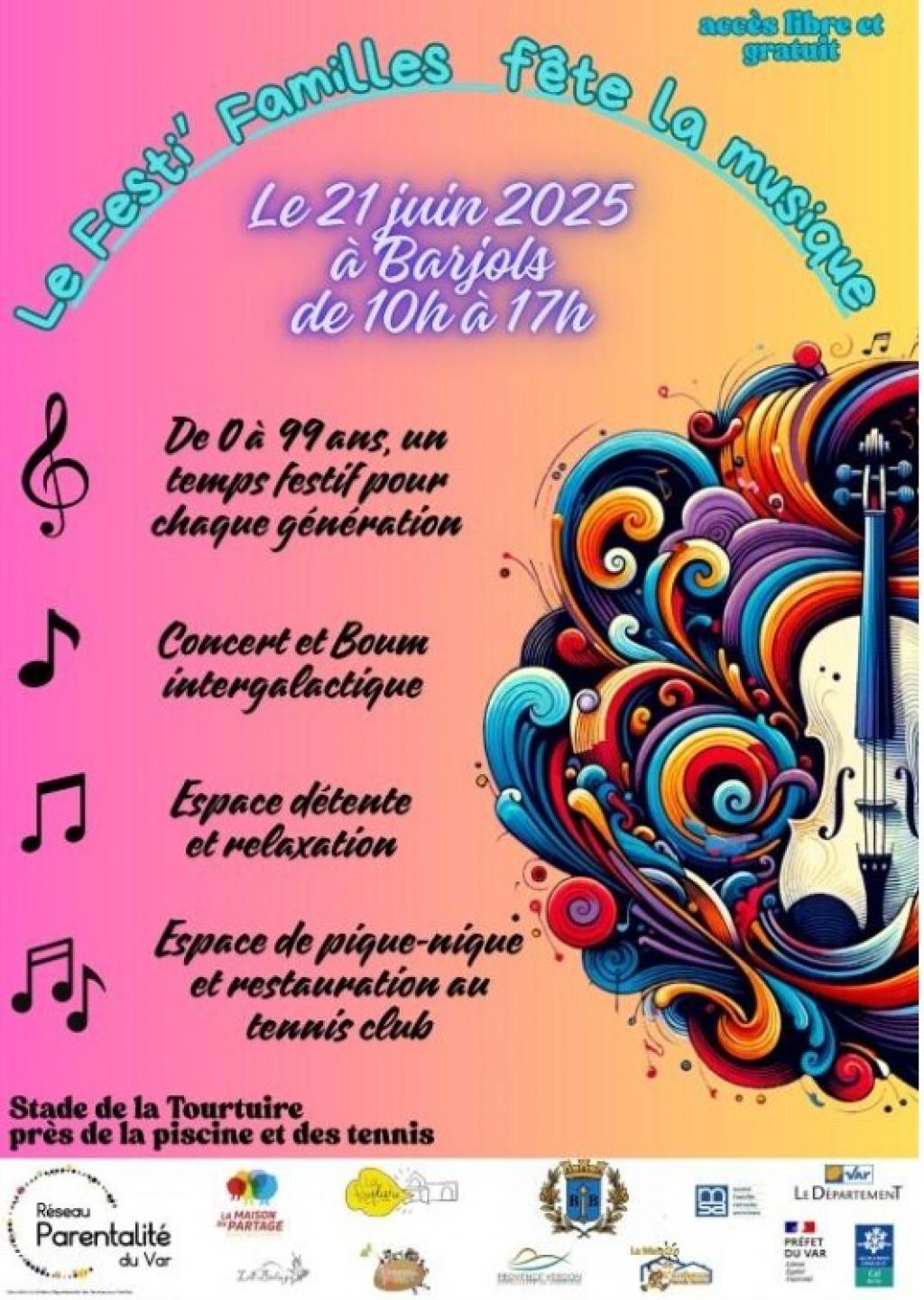 “ Le Réseau Parentalité Provence Verdon est ravi de vous annoncer le retour du Festi-familles sur le thème de la musique ! Un événement festif gratuit et ouvert à tous, de 0 à 99 ans, pour célébrer la musique dans la joie et la convivialité ! ”