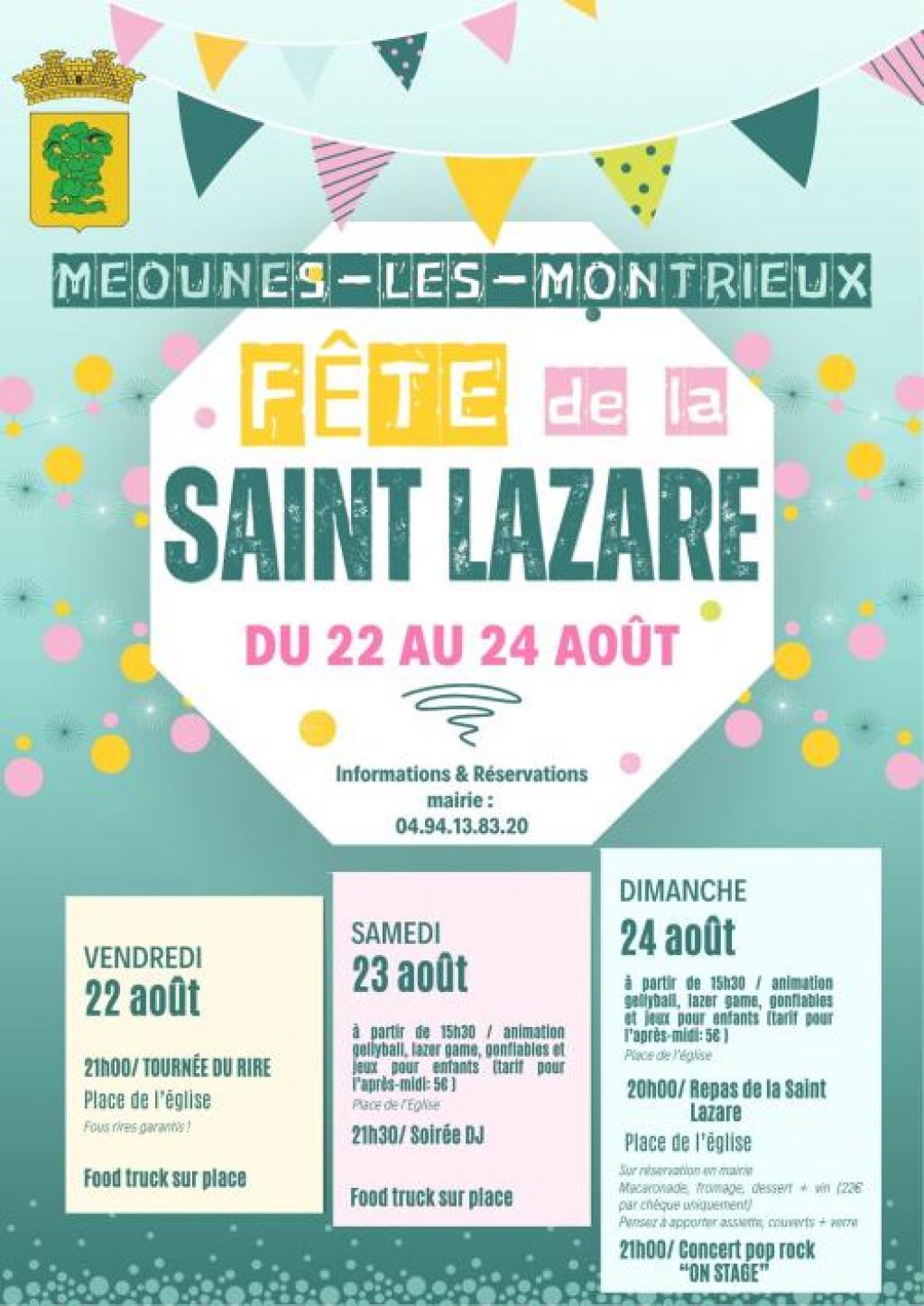 > 20h : Repas de la St Lazare (macaronade, fromage, dessert + vin) réservation en mairie - 22€ par chèque uniquement, apporter assiettes, couverts, verres