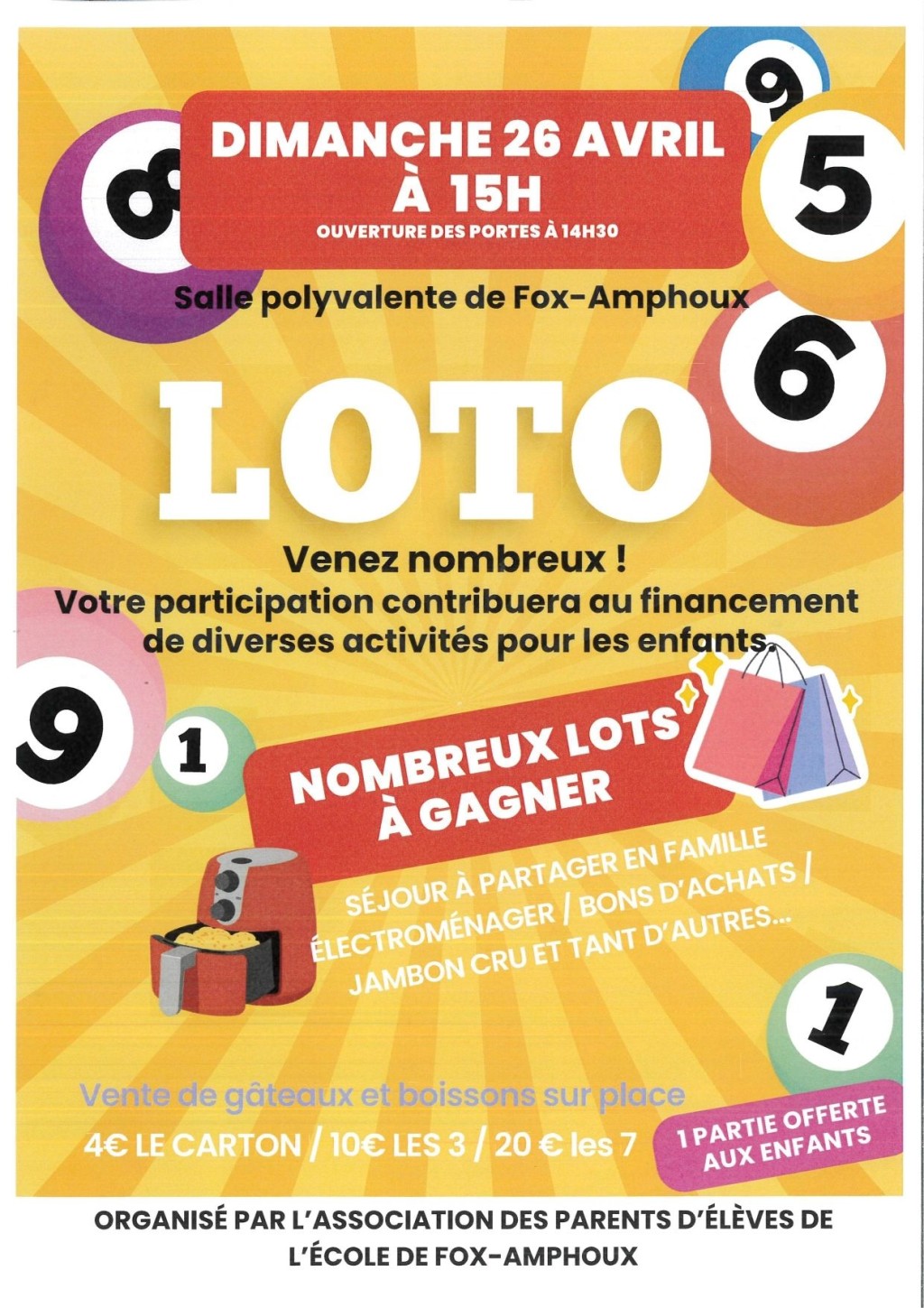 “ De nombreux lots à gagner dont 1 séjour à partager en famille électroménager, bons d'achats et bien d'autres. Votre participation contribuera au financement de diverses activités pour les enfants ”