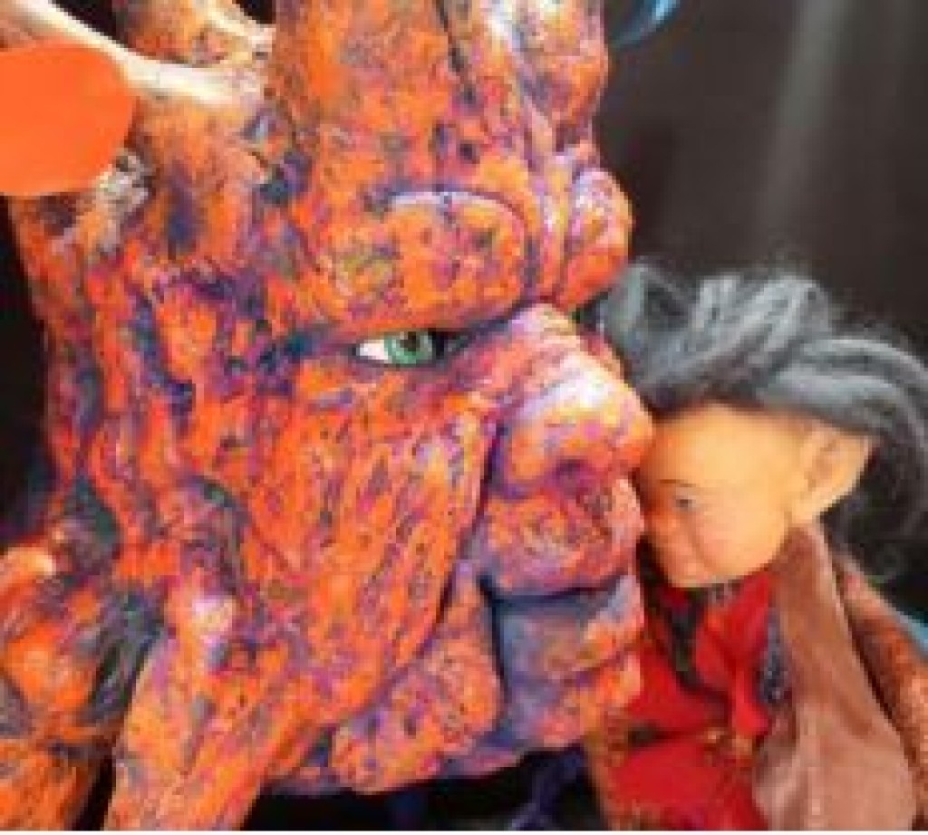 bougonnant apparait tirant derrière lui un monceau de déchets plastiques.