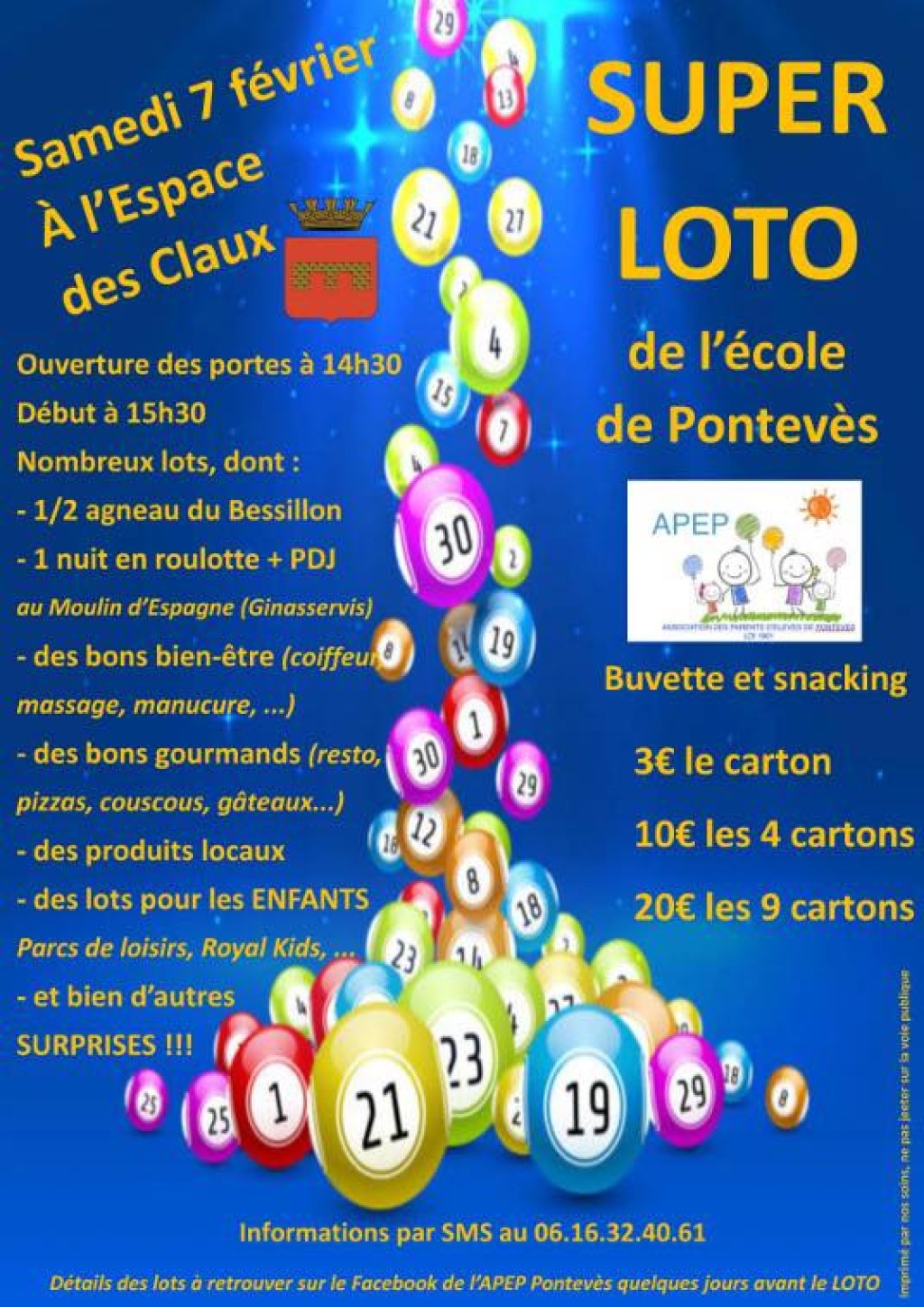 > Le carton : 3 € | Les 4 cartons : 10 €| Les 9 cartons : 20 €.