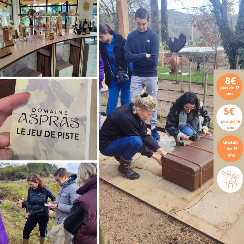 Petits et grands sont les bienvenus au domaine des Aspras pour une enquête de la plus haute importance...Une malle appartenant à la famille Latz, les propriétaires, a disparu... Après consignes et remise des tote bags, les enquêteurs parcourent le domaine à la recherche d'indices et tentent de retrouver ce précieux coffre. Pour couronner la victoire, direction le caveau pour la dégustation des vins (enfin les plus de 18 ans bien entendu)