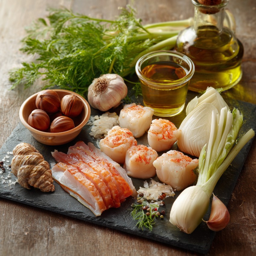 1 - Détacher le corail des noix de St jacques et les mettre dans le blender avec une demi-échalote, une demi-gousse d'ail, une pincée de sel, de poivre et 5 cl d'huile d'olive, puis mixer le tout jusqu'à l'obtention d'une crème onctueuse.