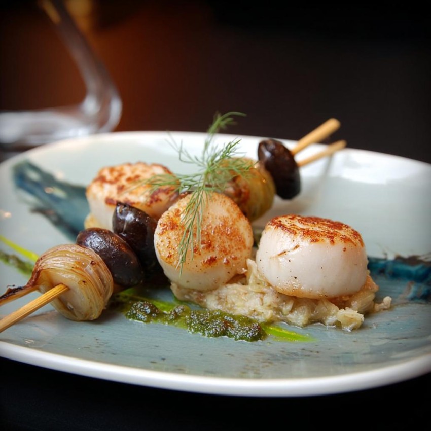4. Dresser 2 brochettes par personne dans une assiette de présentation sur un lit de fenouil confit et décorer d'une virgule de sauce rouge et de sauce verte.