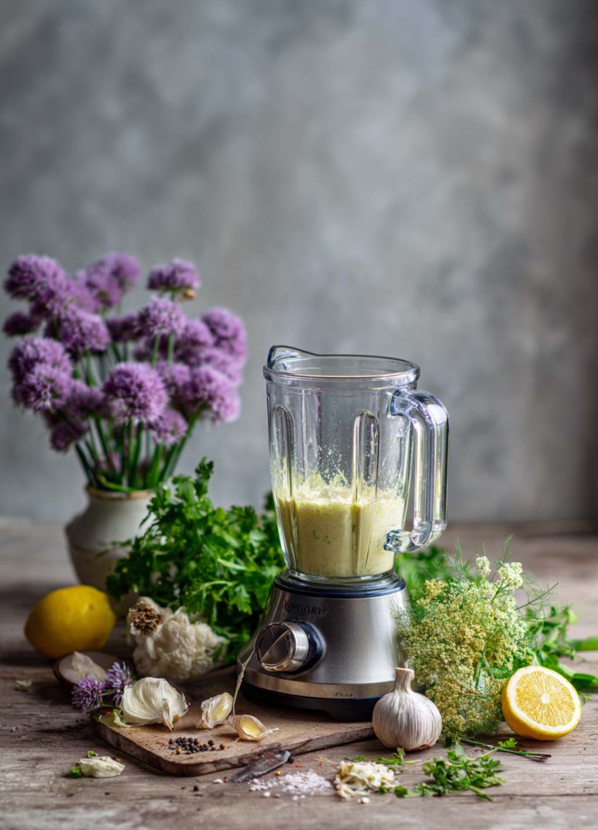 2 - Mixer dans le blender les bouquets de persil et d'aneth, avec une demi-échalote, une gousse d'ail, une pincée de sel, de poivre et 5 cl d'huile d'olive, puis mixer dans le blender jusqu'à l'obtention d'une crème onctueuse.