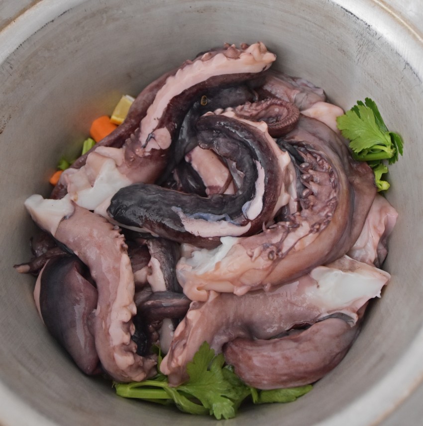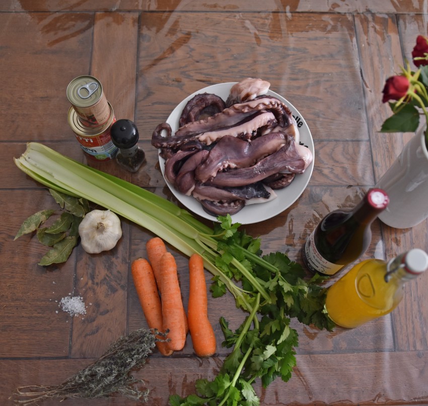 1. Dans un premier temps, préparer un bouillon avec les feuilles des branches de céleri, deux carottes pélées et coupées grossièrement, 3L d'eau, du gros sel, 3 feuilles de laurier et un demi citron, mettre ses tentacules à bouillir pour 45 minutes.