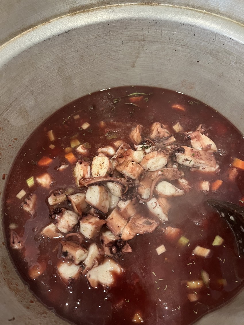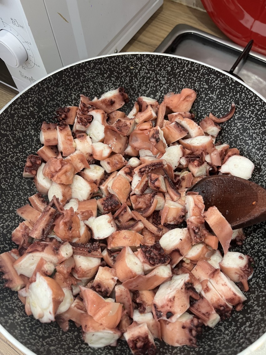 4. Découper les tentacules, les faire revenir dans l'ail et l'huile d'olive à la poêle puis les ajouter à la marmite.