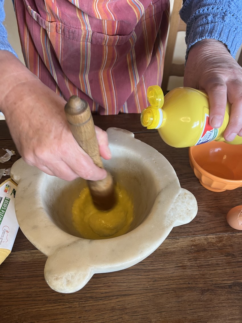 -Verser au fur et à mesure l'huile de votre choix en tournant le pilon jusqu'à trouver une consistance ferme.