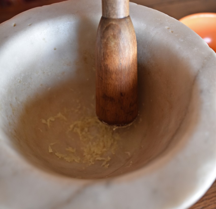 -Dans un mortier, écraser au pilon 4 gousses d'ail