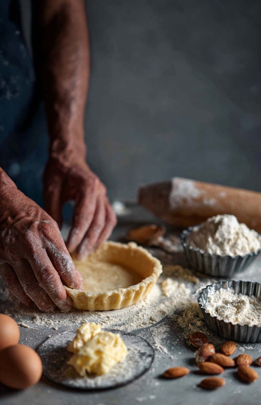 - Pâte sucrée : 150g de beurre, 95g de sucre glace, 30g de poudre d’amandes, 1 œuf, 2g de sel, 250g de farine½ gousse de vanille.