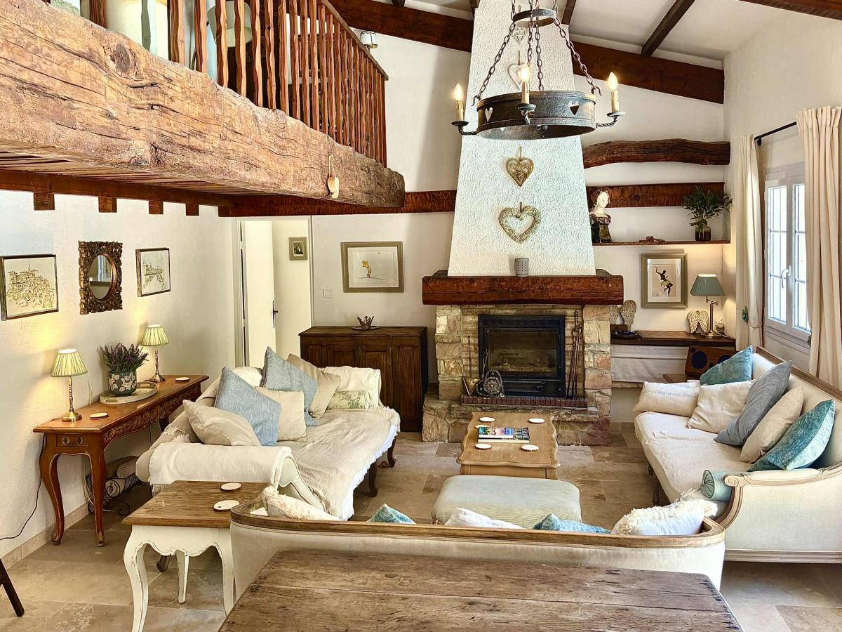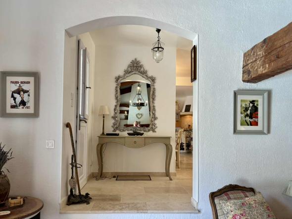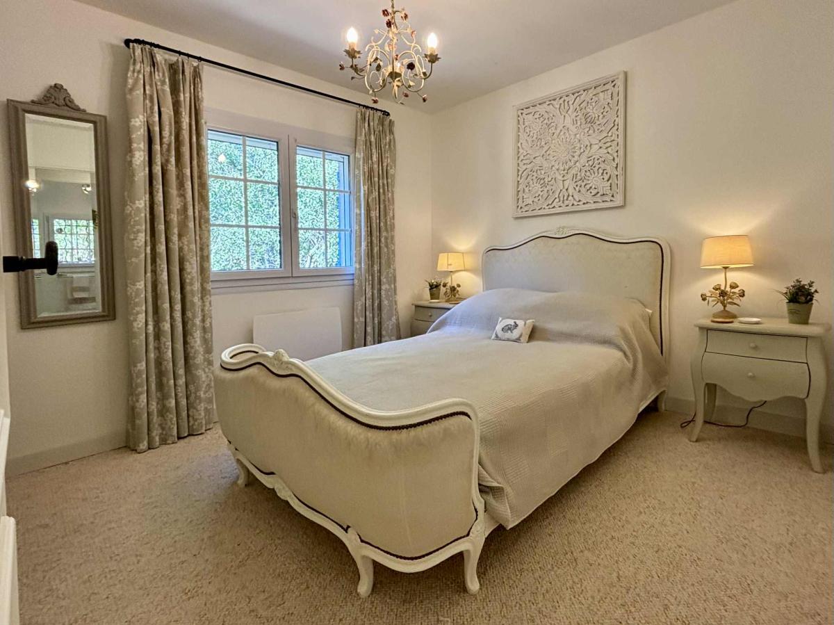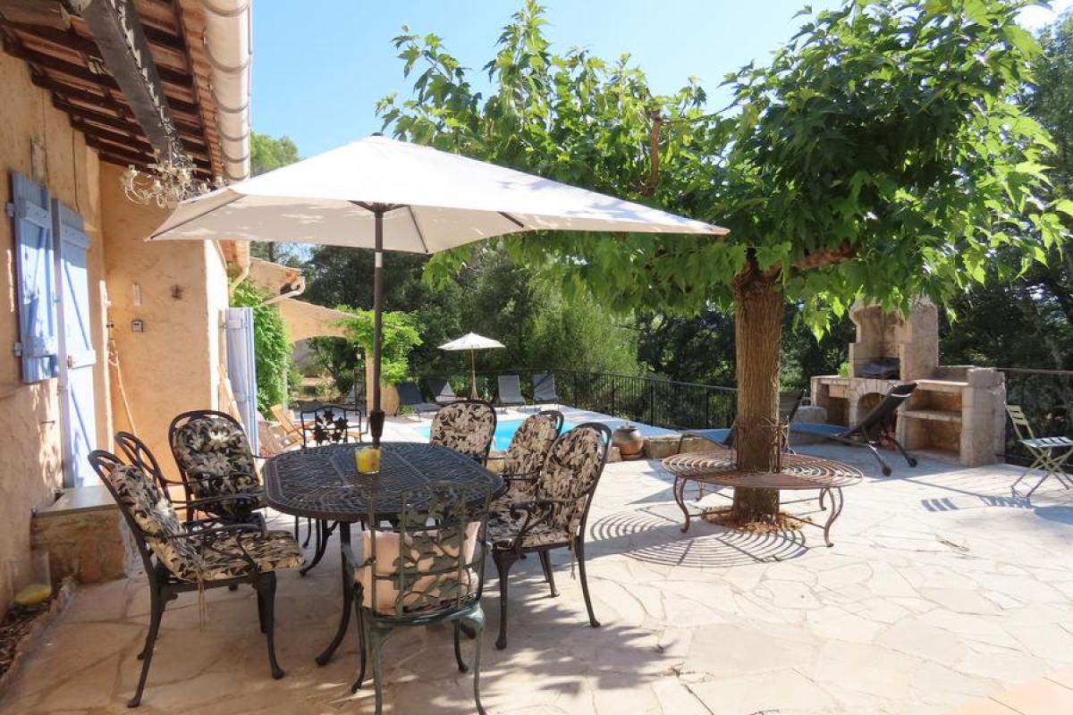 Maison indépendante plain-pied de 170 m² dans un jardin non-clôturé en restanques de 8000 m² avec piscine. Grande cuisine ouverte sur la terrasse, table pour 8 personnes.