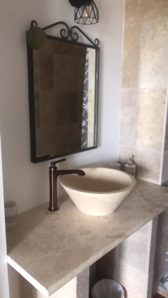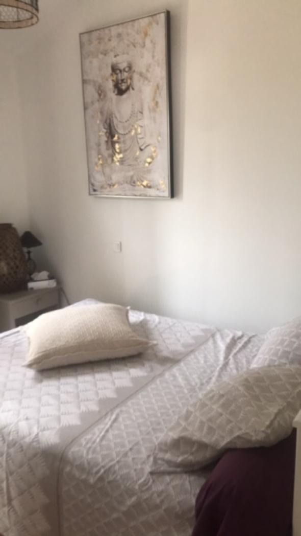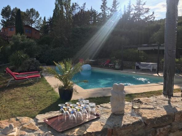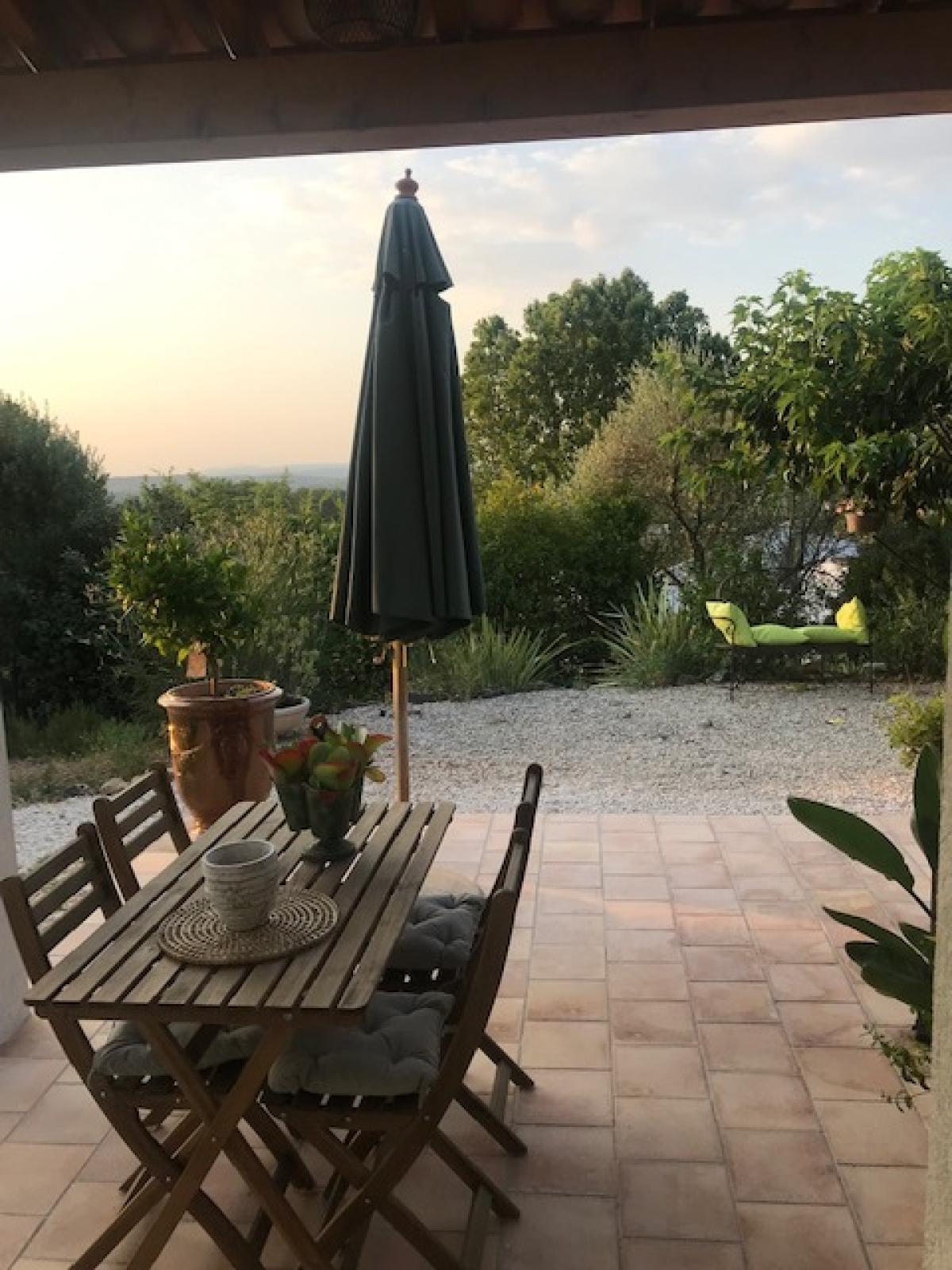 Appartement indépendant de plain pied situé dans la maison des propriétaires, avec un grand jardin fleuri et arboré de 2500 m² en restanque. Vue sur le massif des Maures.