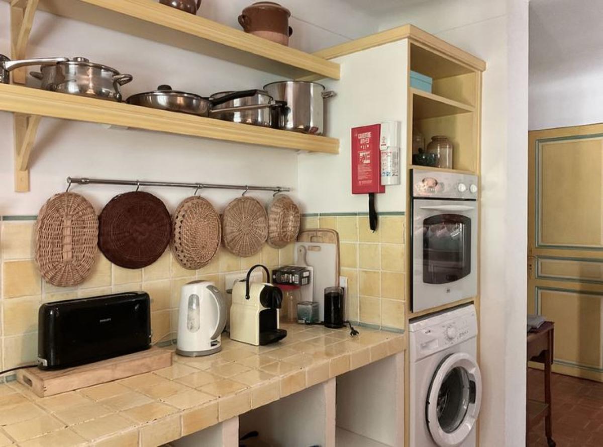 Cuisine avec une porte donnant à l'arrière de la maison, et vers les poubelles de tri. Et une seconde porte vers le cellier pour tous les autres équipements ainsi que pour le rangement des courses.
