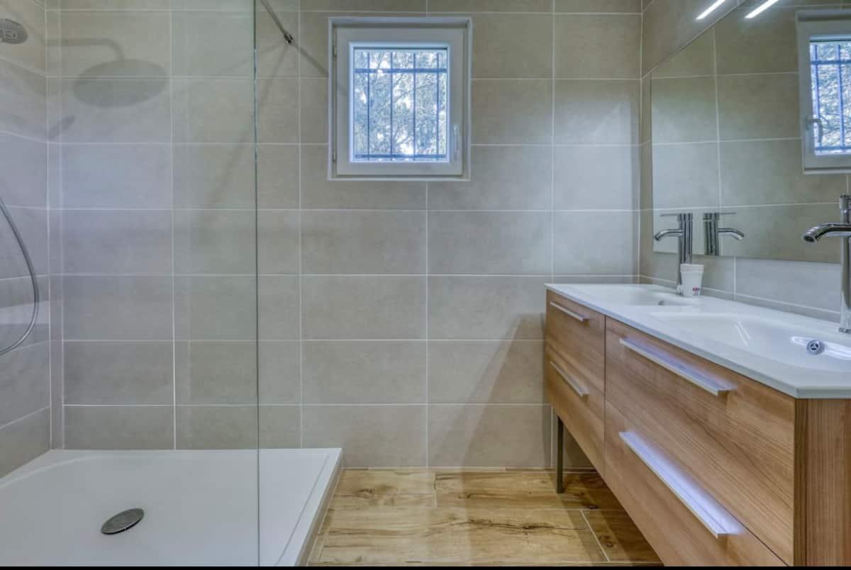 Salle de bain avec fenêtre douche très grande avec deux vasques et lave linge (lessive, savon et shampoing, après shampoing, dentifrice, trousse de secours fournis) .