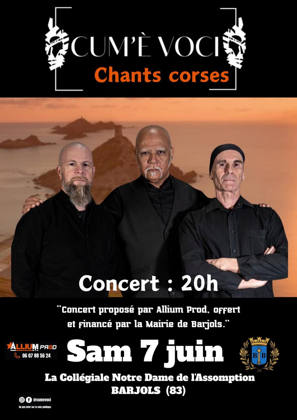 “ Un concert du groupe Cum'è voci pour s'envoler vers l'ile de beauté. Offert par la mairie de Barjols et proposé par AlliumProd ”