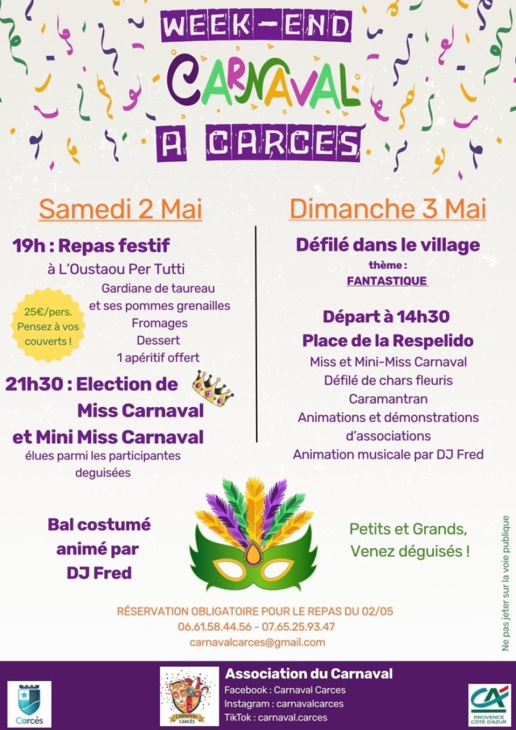“ Venez célébrer le carnaval à Carcès avec un week-end festif incluant un repas, l'élection de Miss et Mini Miss Carnaval, un bal costumé et un grand défilé dans le village sur le thème "Fantastique". Petits et grands, venez déguisés pour l'occasion! ”