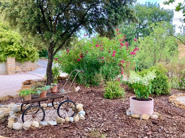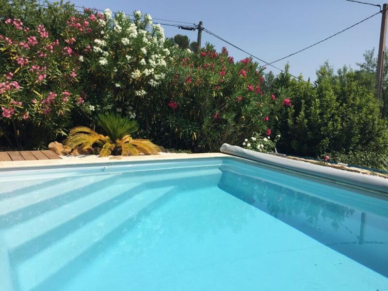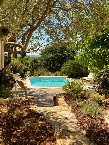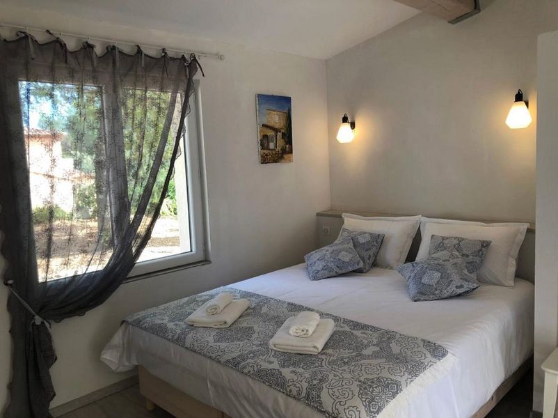 Appartement indépendant plain-pied dans maison individuelle de 34 m² avec deux chambres la Douceur Verte et la Douceur Bleue climatisées tout confort, piscine et terrasse. Situé dans un jardin non clôturé de 2500 m², à 900m du village accessible à pied.