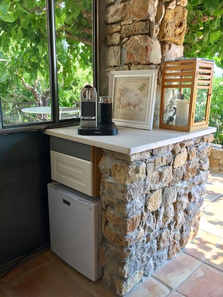 Coin cuisinette équipée ( lave-vaisselle, plaques et four, réfrigérateur/freezer, machine à café Nespresso, grille pain, bouilloire...)