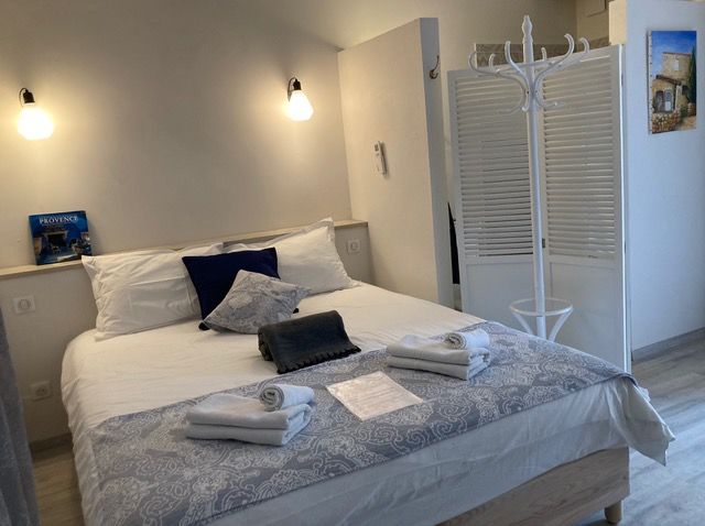 Une ambiance délicate dans la Chambre /Studio Douceur Bleue équipée d'un coin cuisine pour retrouver quelques moments de sérénité. Ouverte sur une petite terrasse privative ombragée.