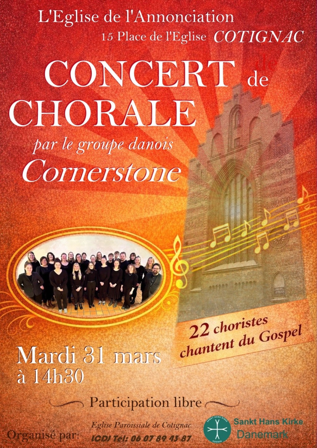“ 22 Choristes chantent du gospel. Ces jeunes chanteurs, membres de la chorale de l'Eglise Sankt Hans d'Odense- la ville enchantée des contes d'Andersen- interpréteront un programme de chants gospel et de chansons rythmées en danois et en anglais. ”