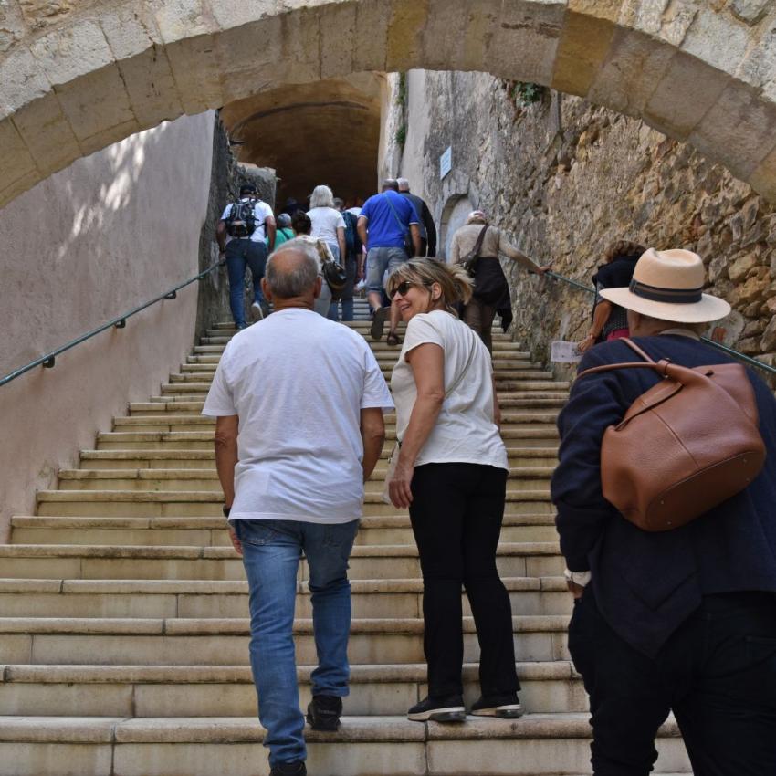 On emprunte ensuite les escaliers blancs attenants à l'Eglise et l'on sent bien que l'on passe les portes de la ville médiévale. La ruelle devient, en haut des escaliers, plus étroite et plus sombre. Les porches et arcades se succèdent, c'est parti pour un voyage dans le temps ...