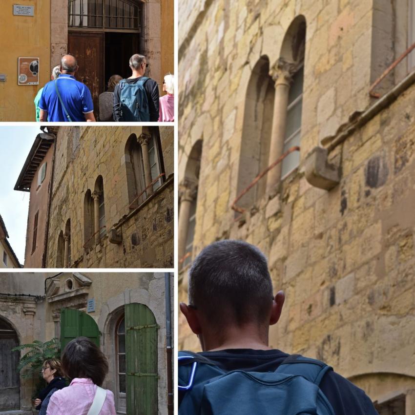 Quelques pas encore et notre guide nous demande de lever les yeux. Quelle surprise que de voir cet ensemble de baies géminées romanes. Les colonettes au centre sont sculptées et ont traversé les âges! Wahou! J'avoue que je me sens un peu coupable, moi qui suis passée par là durant toute mon enfance je ne les avais jamais remarquées.