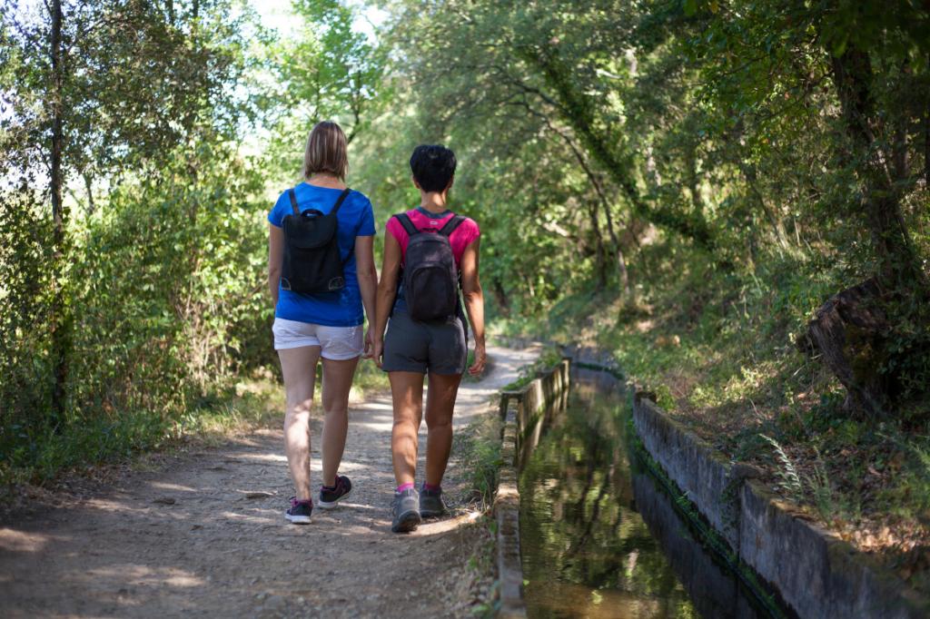 2. Au stop, descendre à gauche. Se faufiler à droite dans le petit passage où se situe un petit lavoir, en face de l’arrêt de bus à côté de la porte bleue. Suivre le canal, au bout, tourner à gauche sur la route goudronnée. A l’intersection poursuivre en direction des chapelles Notre-Dame & Saint-Jaume. Passer devant les 2 chapelles.