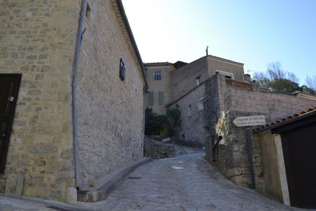1- Continuer en face dans la Grande Rue. Dépasser la fontaine à la Marianne, puis à la Maison Bonaparte, monter à droite dans l’impasse Saint-Esprit. Au bout de l’impasse, tourner à gauche, dépasser les ruines de l’ancien château et poursuivre la montée (en suivant les panneaux « Chapelle Saint-Michel - Colline de la Vierge »). À l’intersection, faire un aller-retour jusqu’à la Vierge du Château (point panoramique). De retour à l’intersection, poursuivre l’itinéraire à gauche.