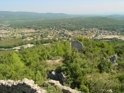 1- Traverser la DN7 (attention !) sur le passage piéton et prendre le chemin de la Tuilière qui s'élève en face, remonter ce petit chemin de campagne et ses champs de vigne jusqu'au château des Brigands. Après le domaine, continuer à droite sur le chemin de la Tuilière pour atteindre la forêt. Après les maisons, dépasser la barrière DFCI et continuer sur la piste forestière pendant 500 m jusqu'à la maison des carriers (en ruine).