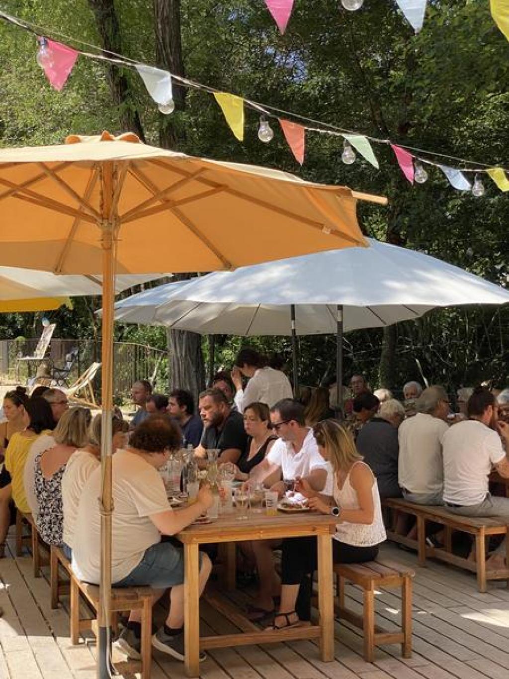 À la Guinguette, on se pose autour d'une table avec les copains et on se laisse bercer par le doux son des cigales, le clapotis du Gapeau qui longe la terrasse, le grésillement des brochettes qui cuit sur la braise, le bruit des glaçons qui n’en finissent plus de fondre, les éclats de rires des tables d’à côté, l’entrechoc des boules de pétanque…