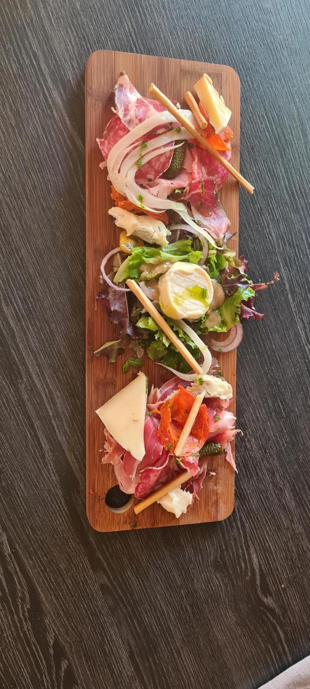 Petite carte de produits frais, changeante selon les saisons, terrasse ombragée avec jolie vue. Soirées organisées ponctuellement.