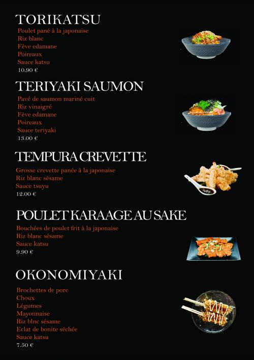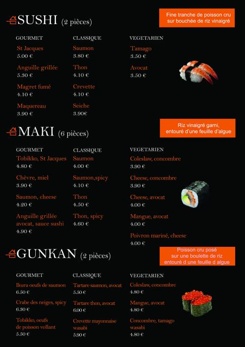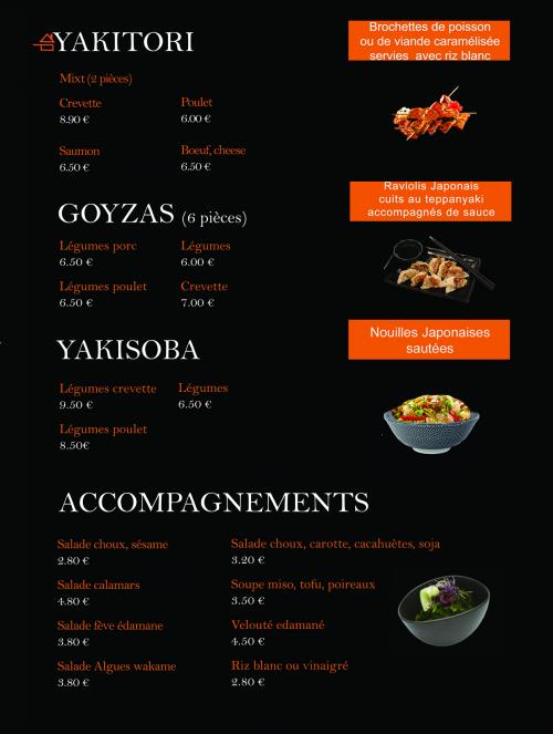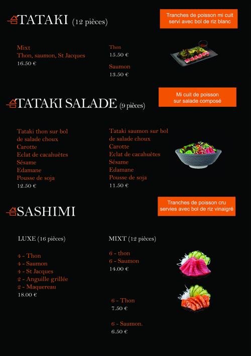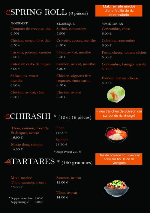 Choisissez parmi une sélection de sushis, sashimis, tartares, makis, californias, chirashi, tataki, torikatsu,yakitori et accompagnements.