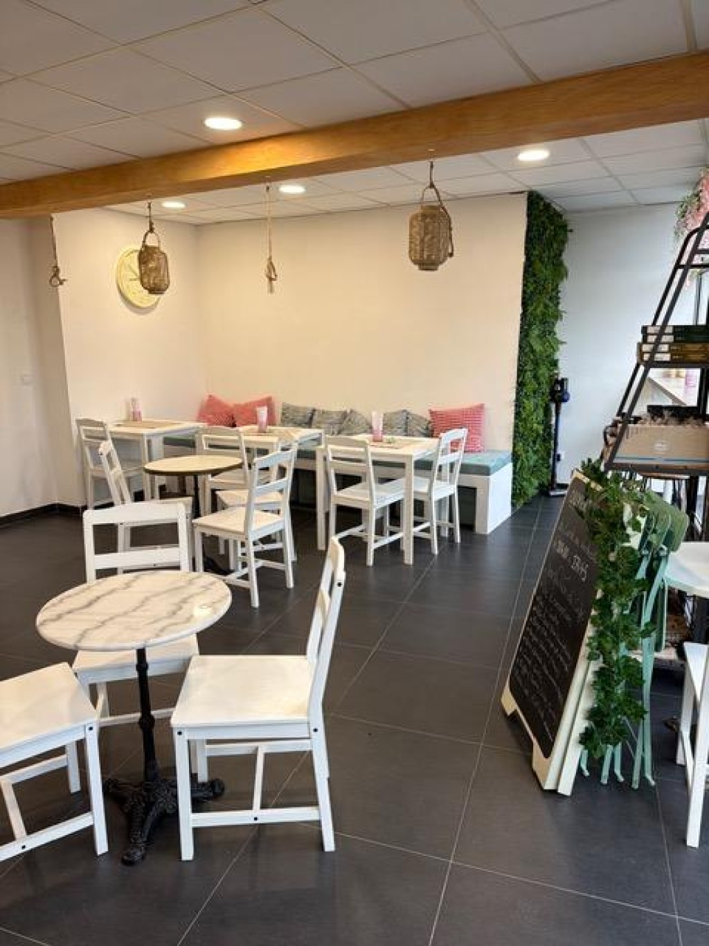 Café tendance ambiance cosy. Un lieu chaleureux et moderne, où l’ambiance douce, le bois, les couleurs pastel et les touches végétales donnent instantanément envie de s’installer et de savourer un moment gourmand.