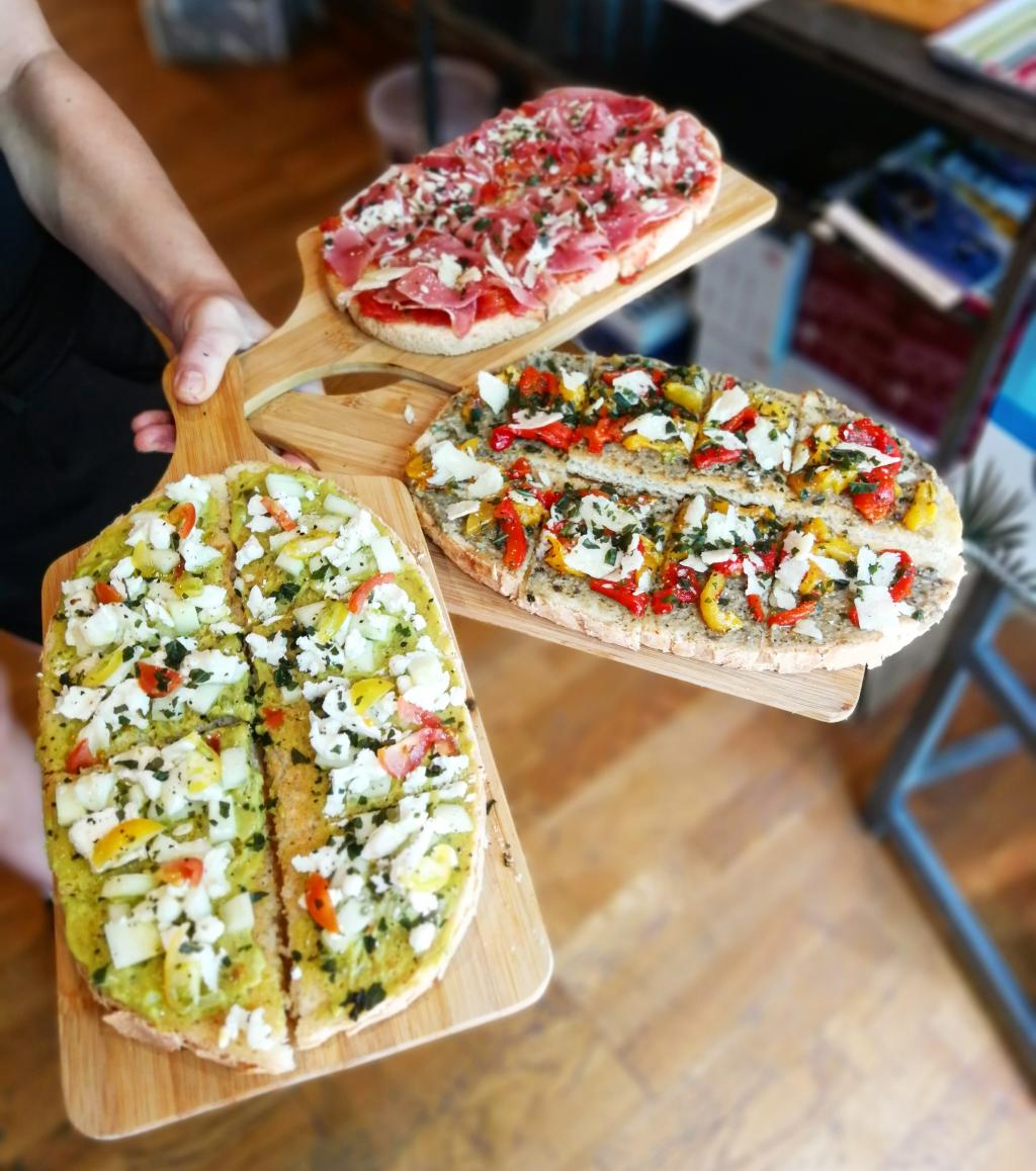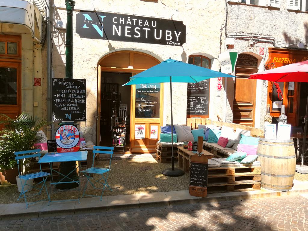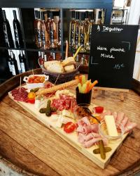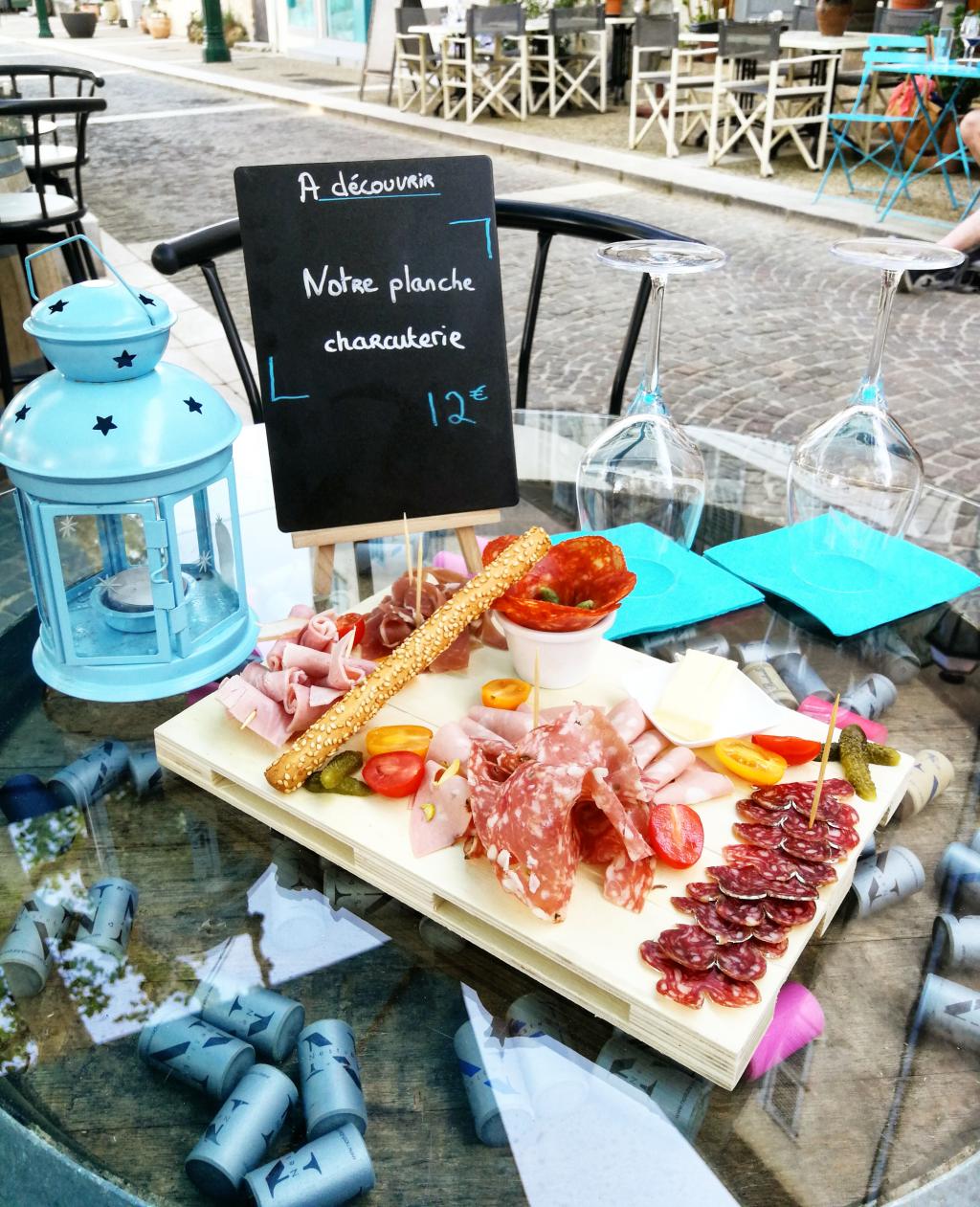 Nous travaillons essentiellement avec des produits régionaux qui sont dégustables sur place ou à emporter. Décoration : tonneaux en bois, canapés lounges en palette, petites tables intérieures individuelles.