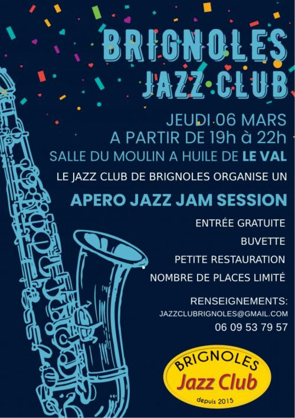 “ Le jazz club de Brignoles organise un apéro jazz , jam session. Buvette et petite restauration sur place. ”