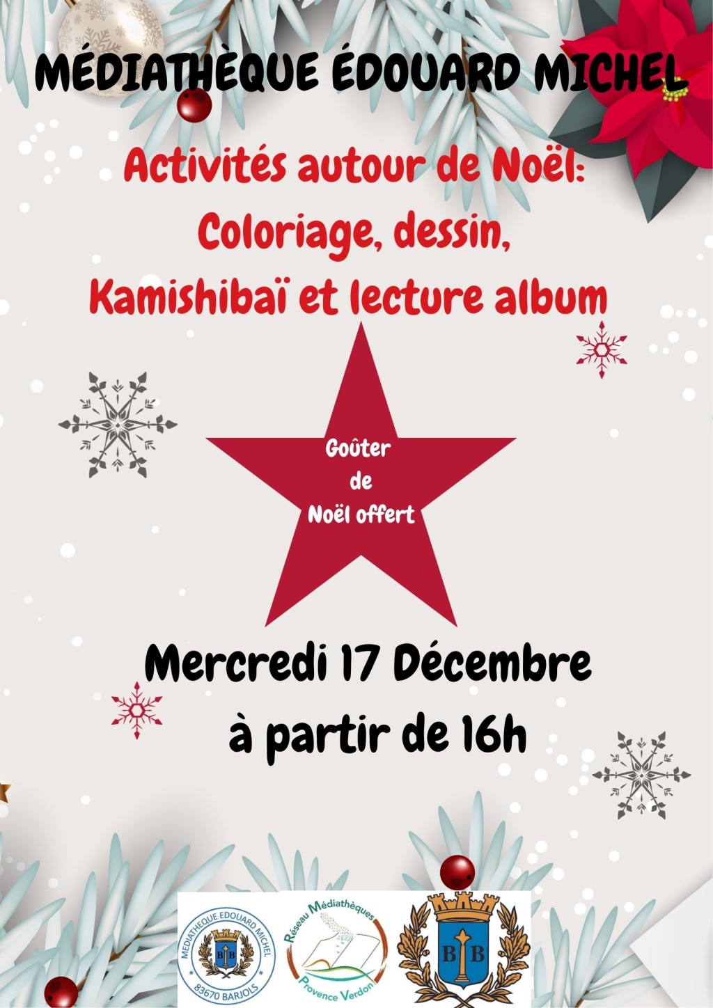 “ Une semaine avant le Réveillon de Noël, venez découvrir et participer à différentes activités créatives (coloriage, dessins, lecture, kamishibaï) avant de profiter d'un goûter de Noël offert ! ”