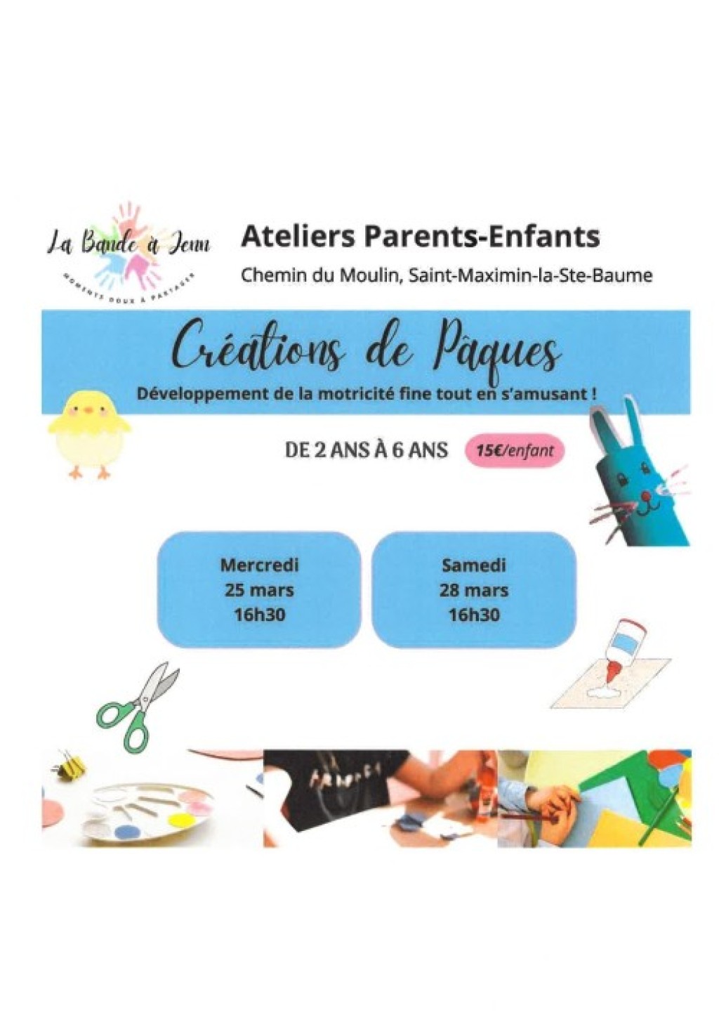 “ C'est bientôt Pâques ! Venez créer de magnifiques décorations colorées pour célébrer le printemps. Au programme, la motricité fine sera mise en lumière avec le découpage, l'assemblage, le collage et la décoration. Ateliers parent/enfant ”