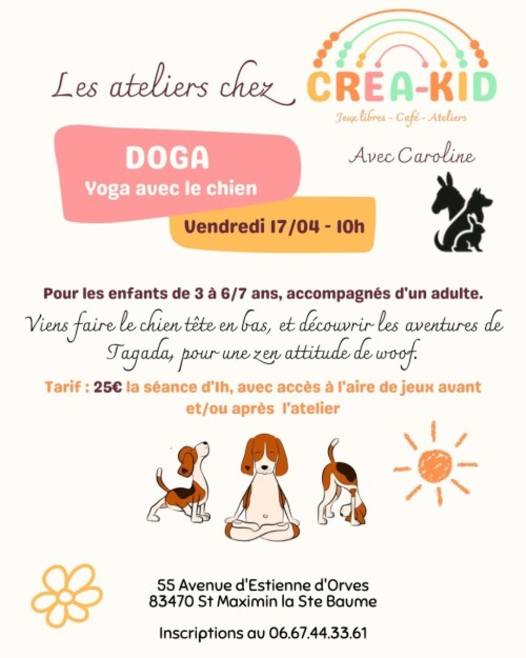 “ Atelier de yoga avec le chien pour les enfants, accompagnés d'un adulte. Venez découvrir les aventures de Tagada, faire le chien tête en bas pour une zen attitude de woof. ”