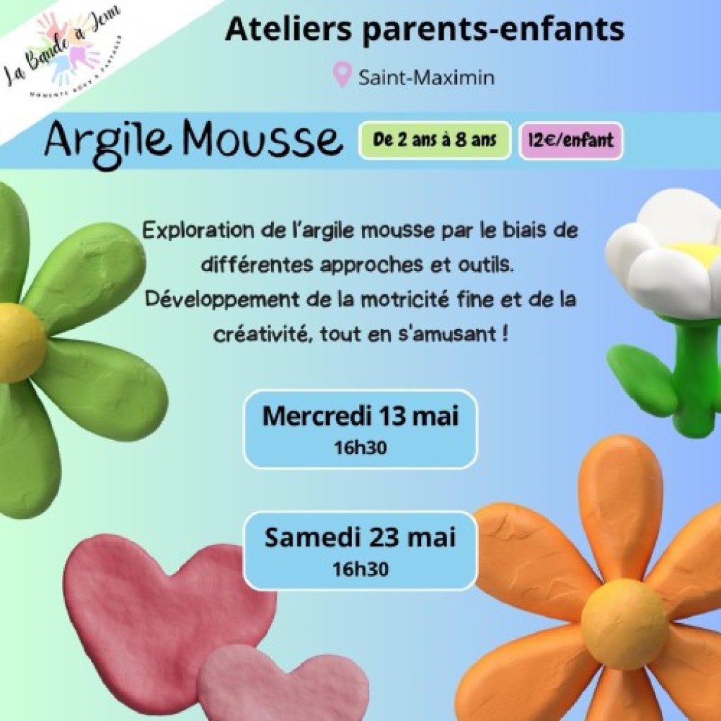 “ Venez découvrir l'argile mousse et créer avec cette matière surprenante. Venez créer vos propres couleurs en mélangeant les couleurs primaires. ”