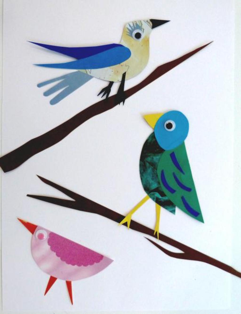 “ Après la découverte des oiseaux de l'exposition de Katia Kameli, crée des formes dans divers papiers qui, assemblés, vont donner vie à des oiseaux multicolores. ”