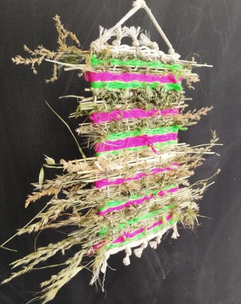“ Cueillette dans le jardin de sculptures et réalisation d'une création tissées, entremêlée de végétaux et fibres de coton. ”