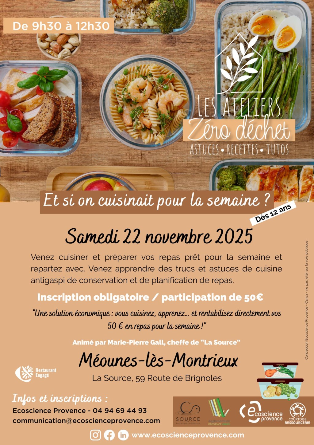 “ Venez cuisiner et préparer vos repas pour la semaine et repartez avec. Venez apprendre des trucs et astuces de cuisine antigaspi de conservation et de planification de repas ”