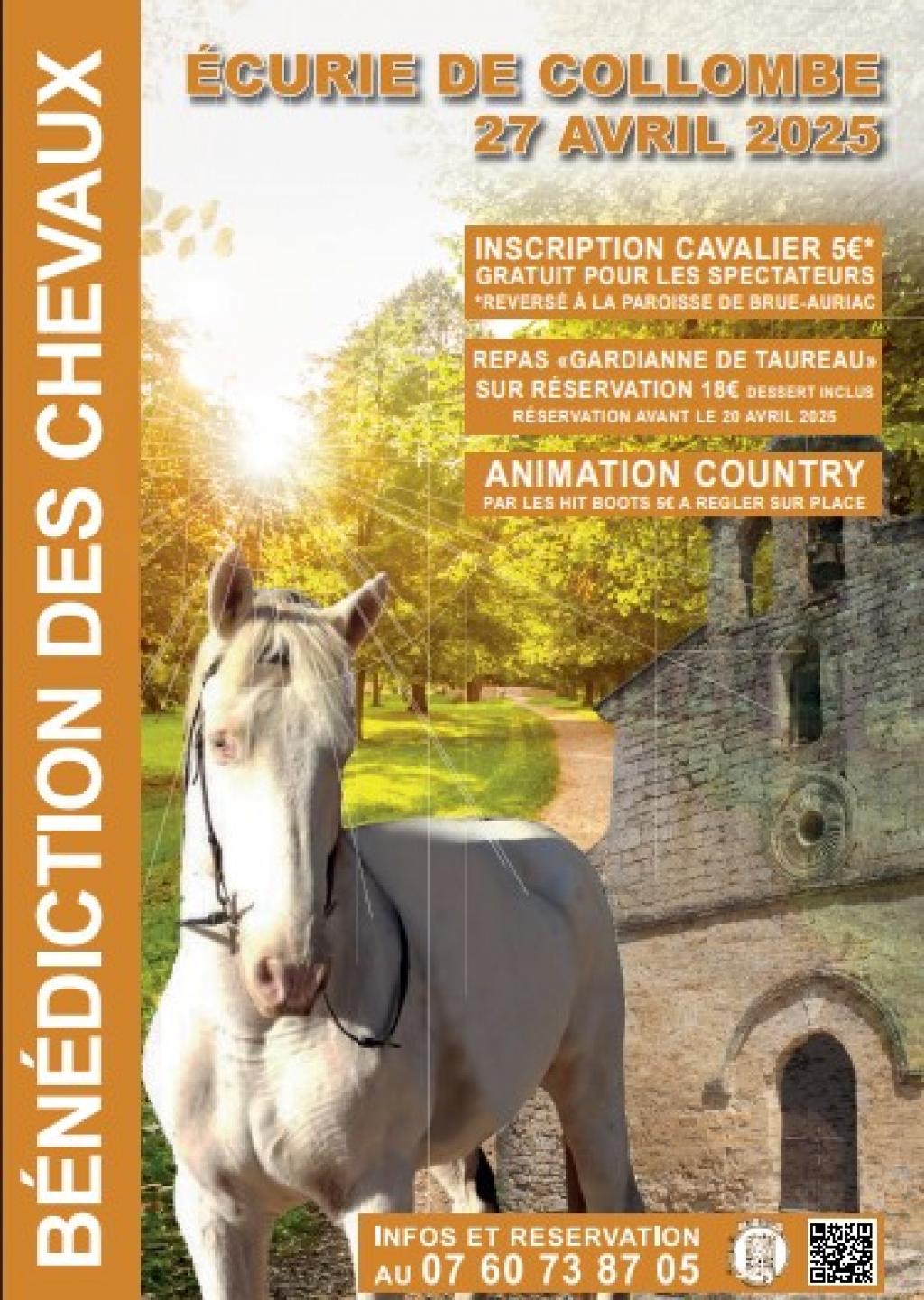 “ Une journée qui débute par la bénédiction des cavaliers et chevaux de la région. Par la suite, un repas (gardianne de taureau et dessert ) sera servi à l'écurie de Collombe. Vous trouverez sur le site une buvette, un marché artisanal,... ”